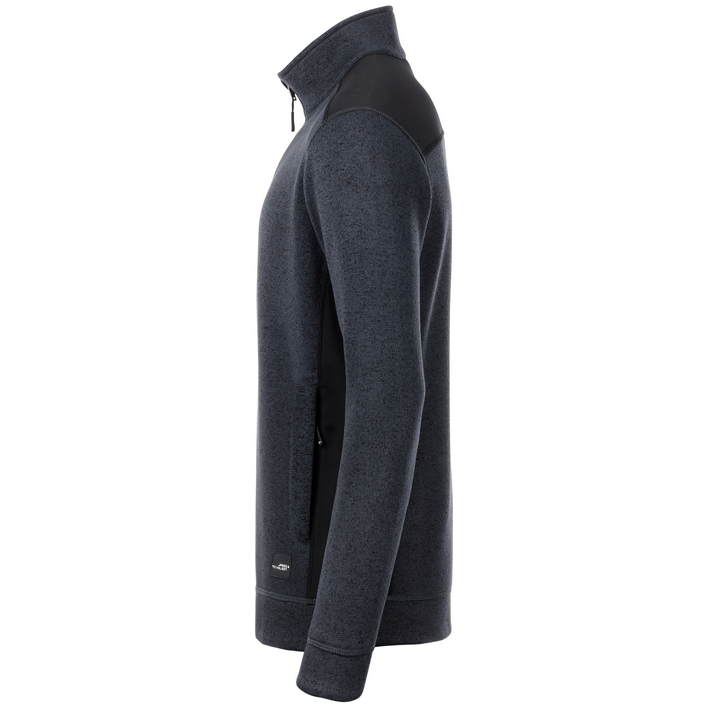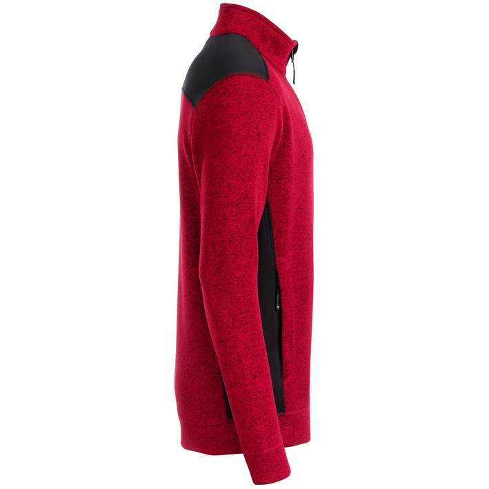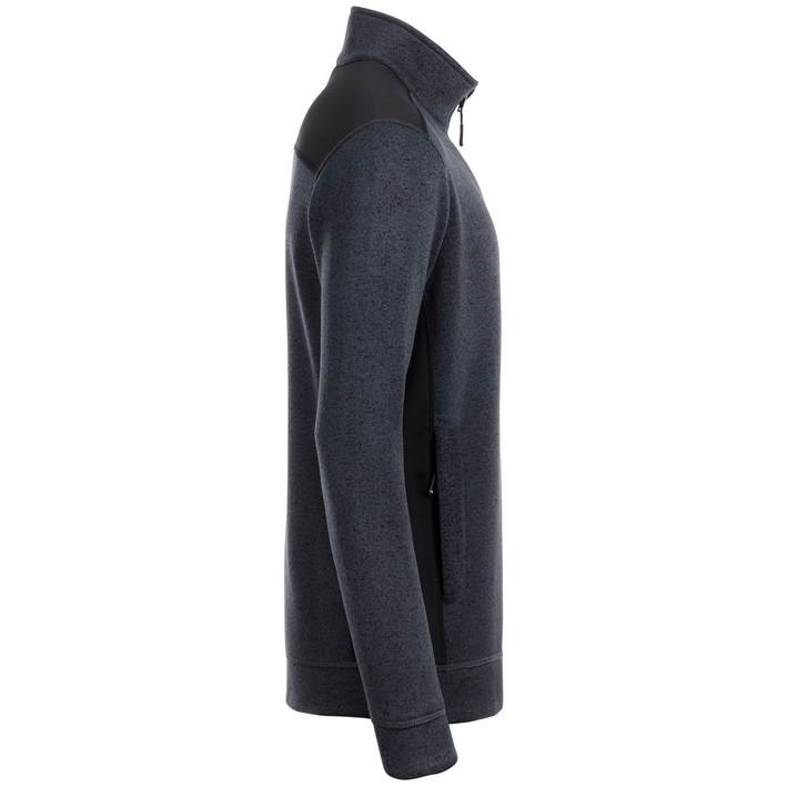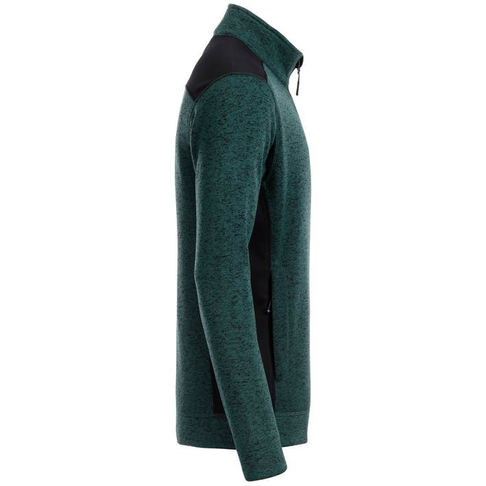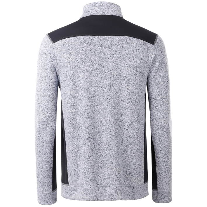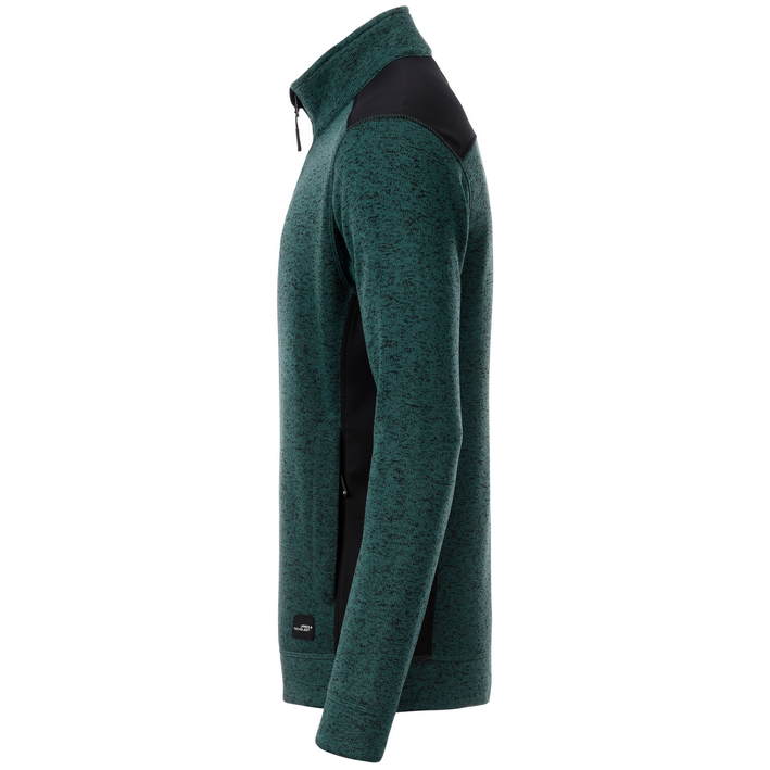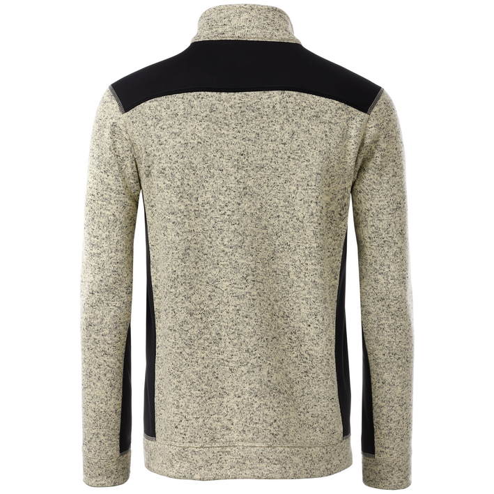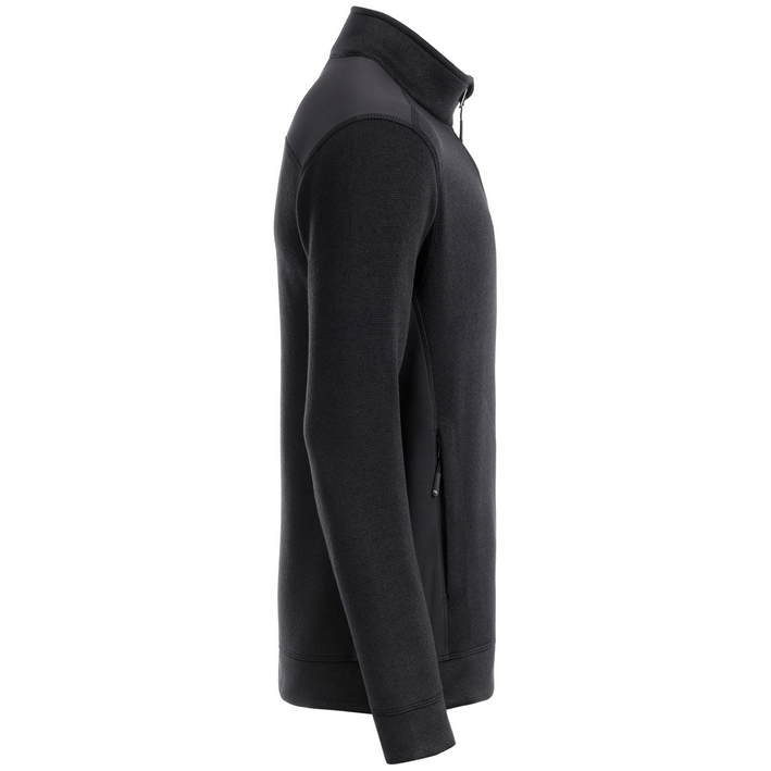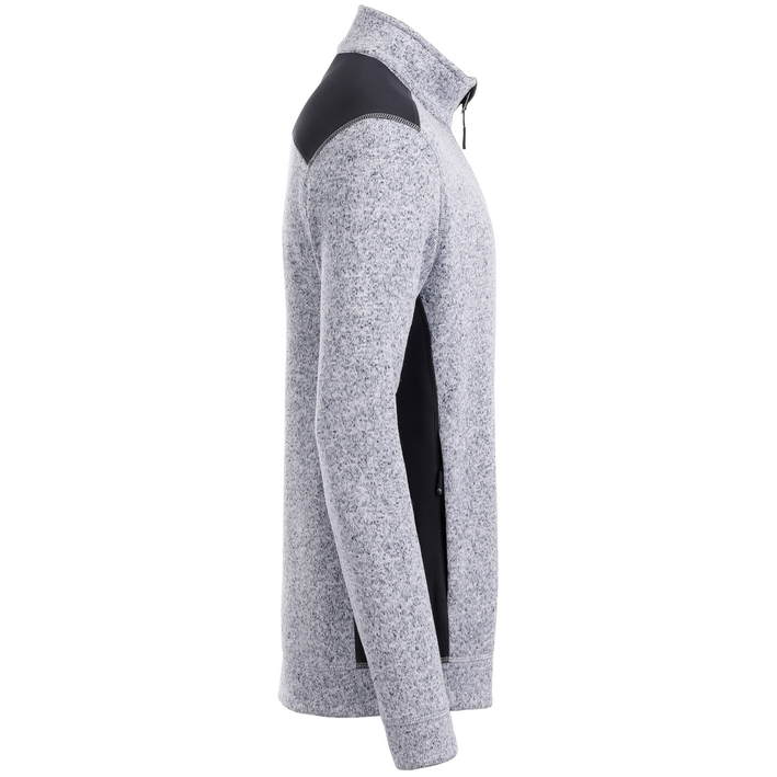 Stoječi ovratnik, polna dolžina zadrge z zaščito za brado, elastični softshell vstavki na rokavih, ramenih in bočni strani, 2 stranska žepa s skrito zadrgo, topla in mehka tkanina melange videza, zunanji pleten videz, v notranjosti mehka in puhasta.
