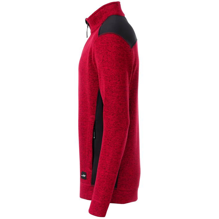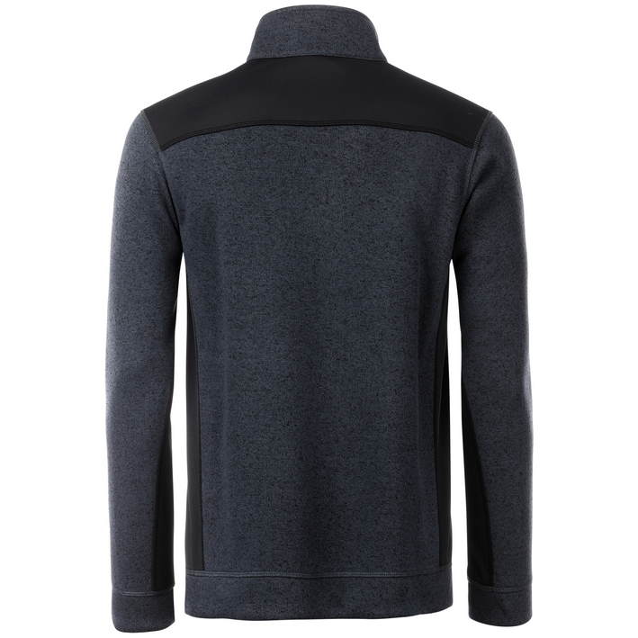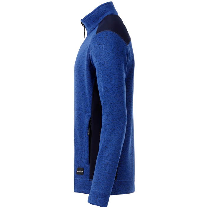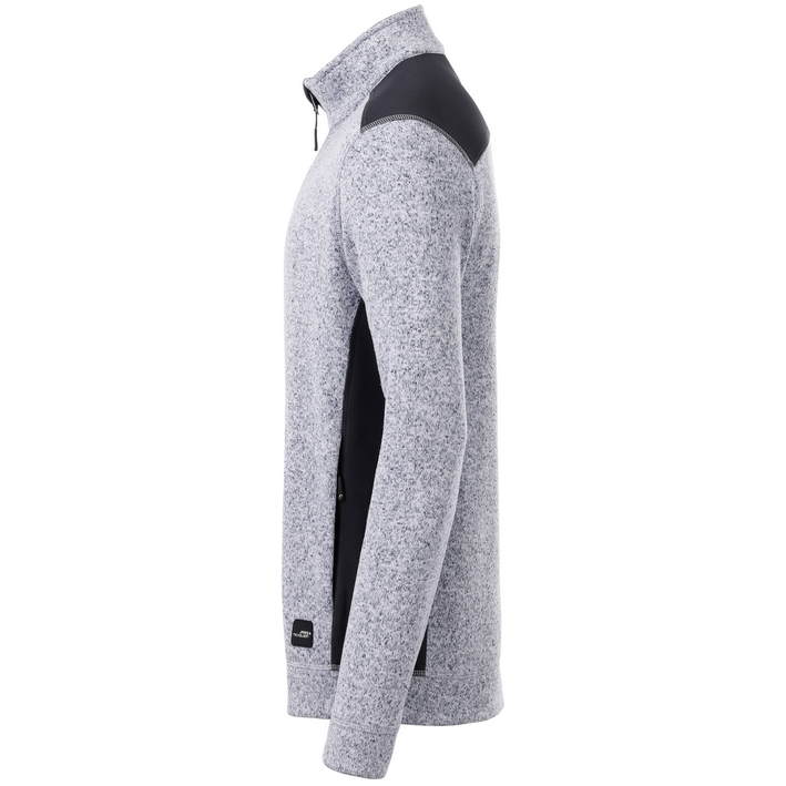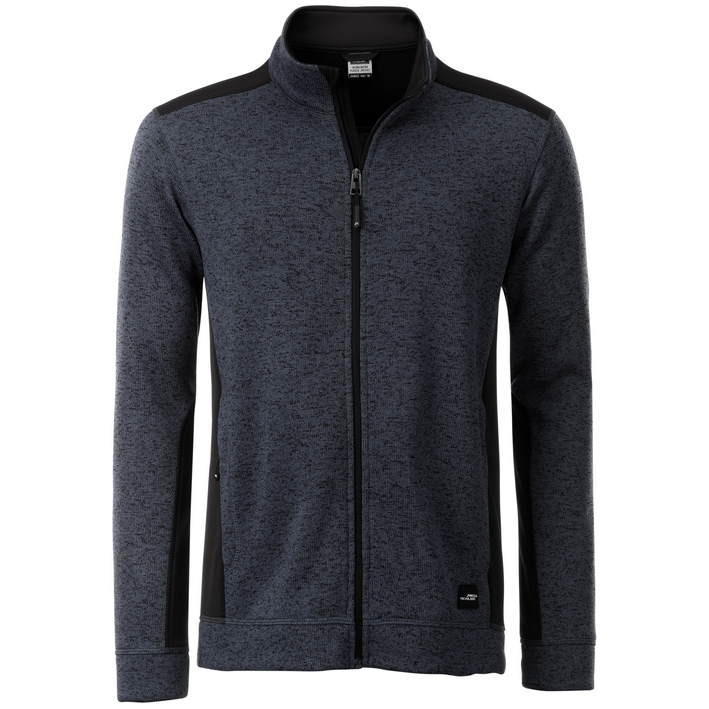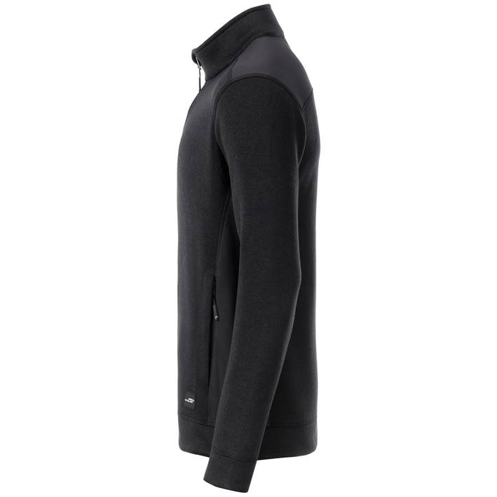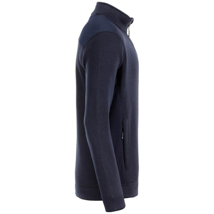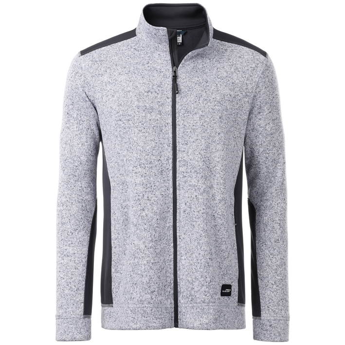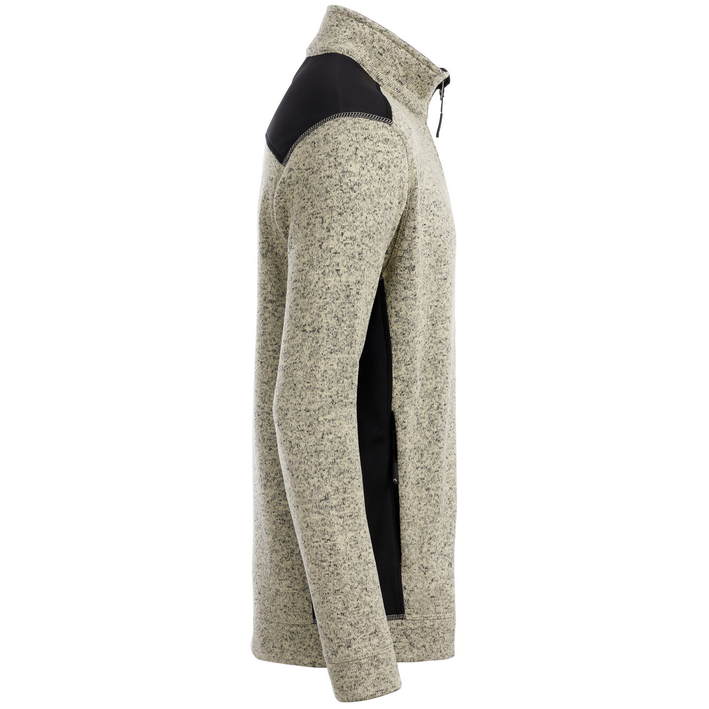 Stoječi ovratnik, polna dolžina zadrge z zaščito za brado, elastični softshell vstavki na rokavih, ramenih in bočni strani, 2 stranska žepa s skrito zadrgo, topla in mehka tkanina melange videza, zunanji pleten videz, v notranjosti mehka in puhasta.