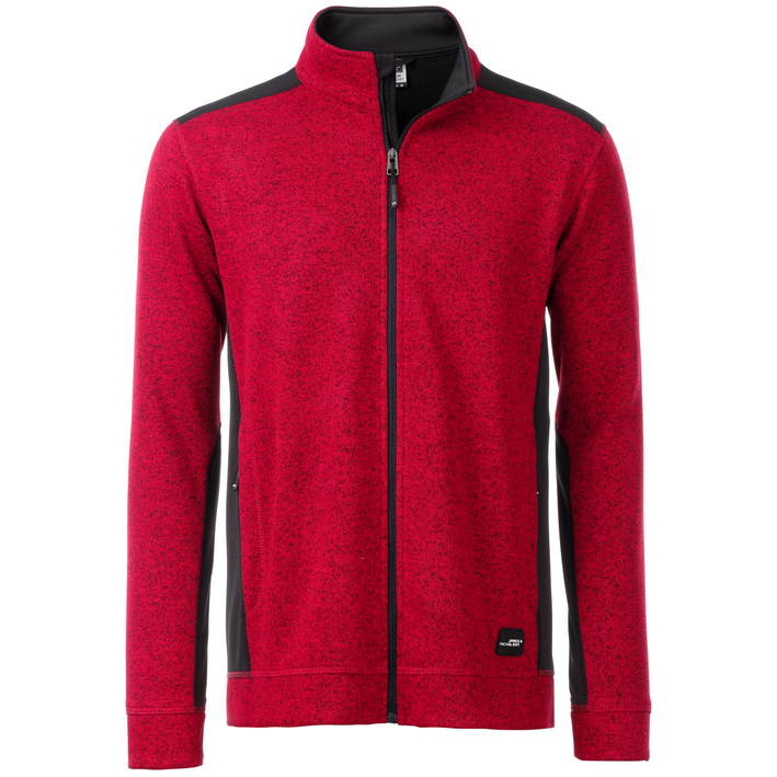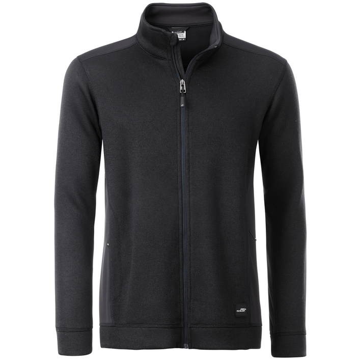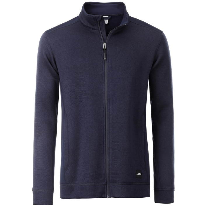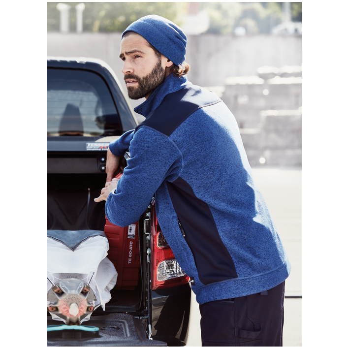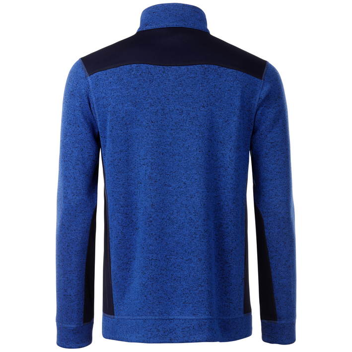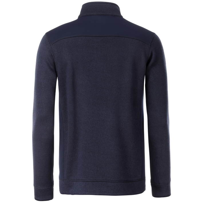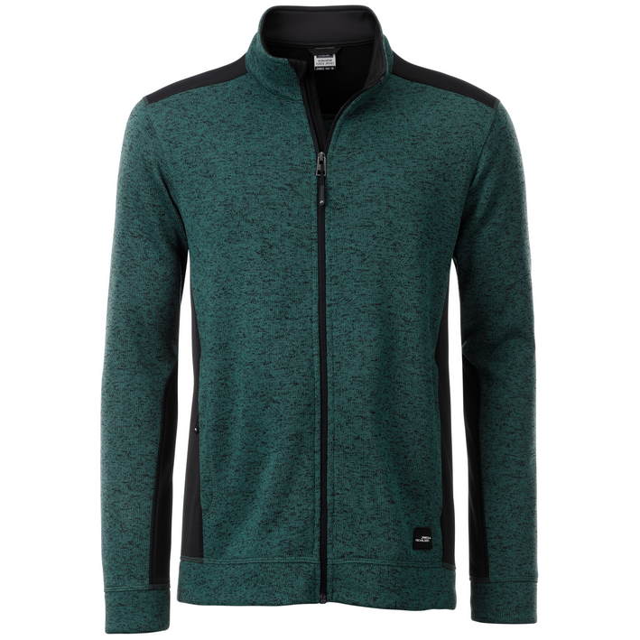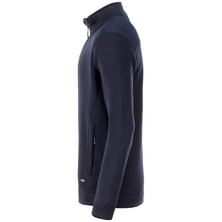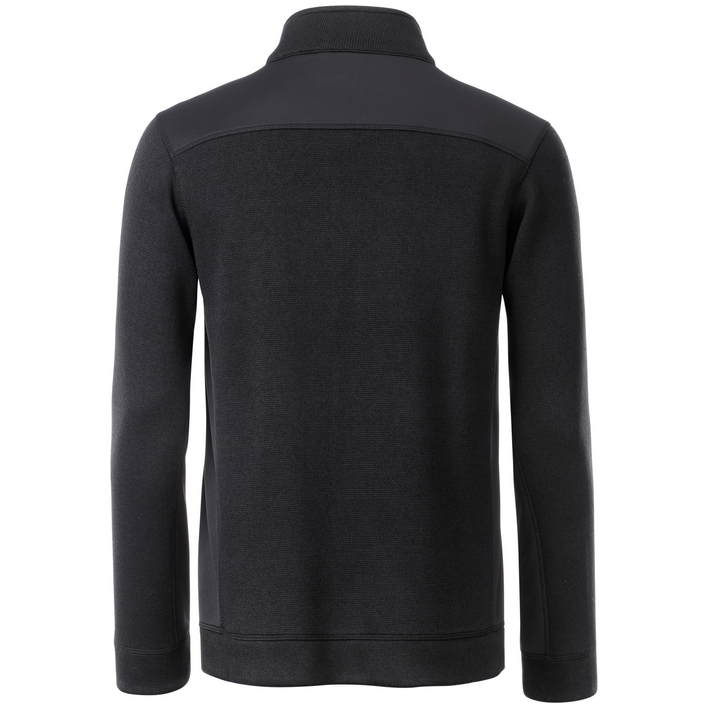 Stoječi ovratnik, polna dolžina zadrge z zaščito za brado, elastični softshell vstavki na rokavih, ramenih in bočni strani, 2 stranska žepa s skrito zadrgo, topla in mehka tkanina melange videza, zunanji pleten videz, v notranjosti mehka in puhasta.