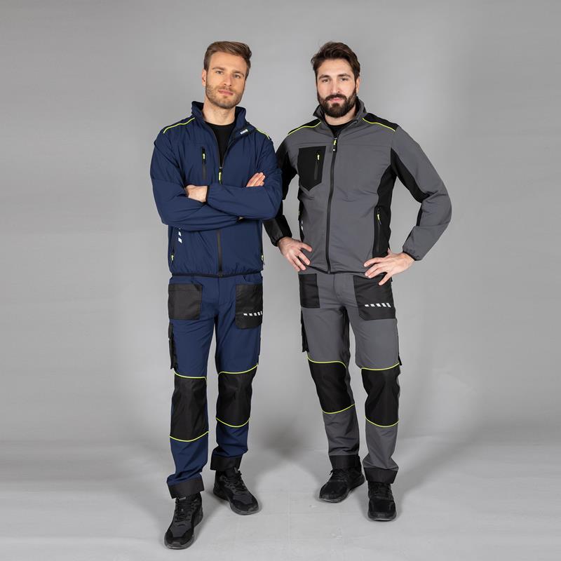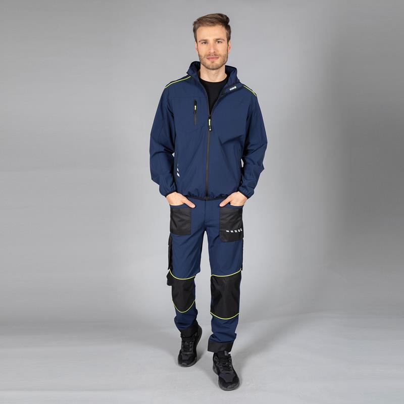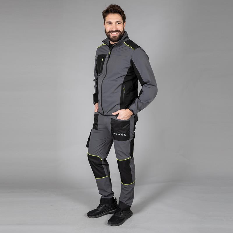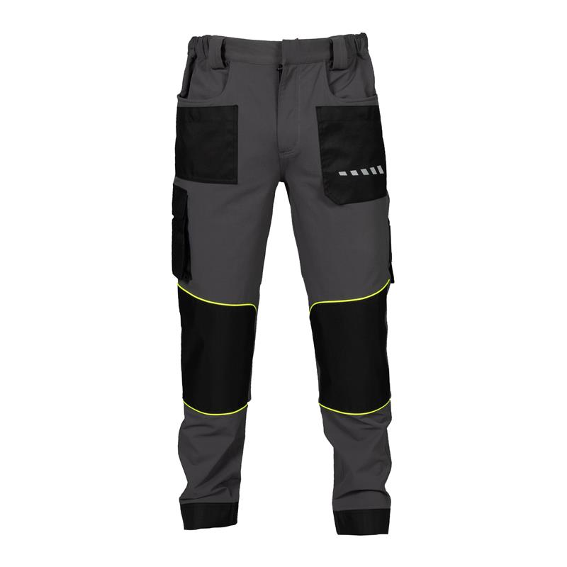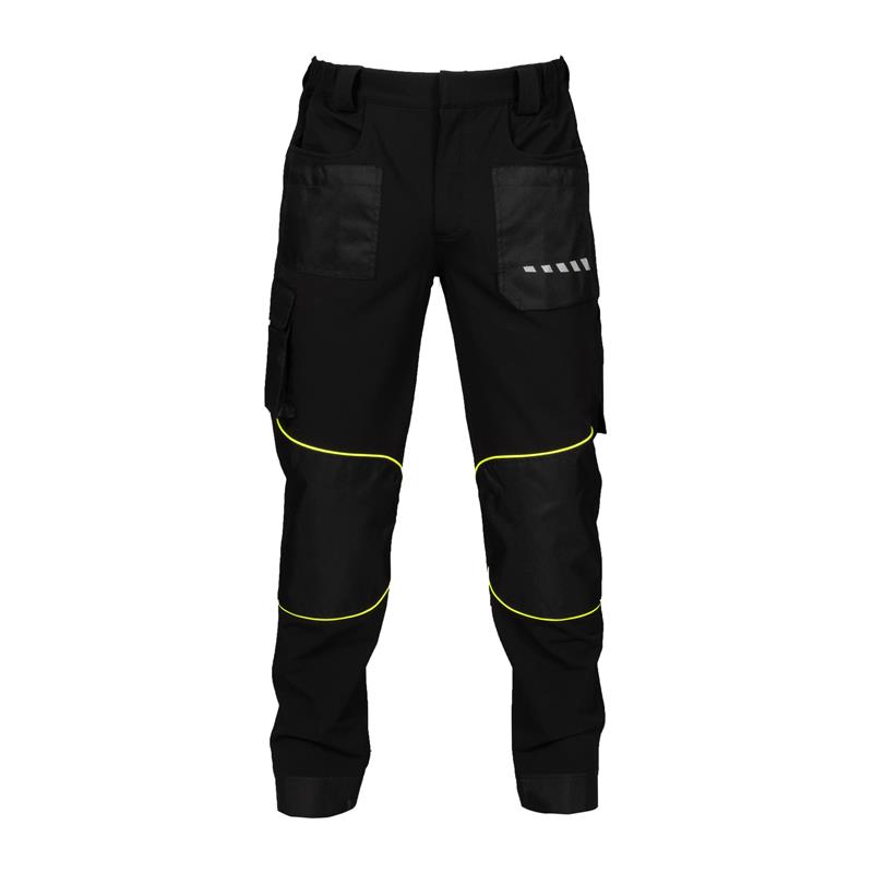 Opis TROUSERS IN STRETCH FABRIC HORIZONTALLY AND VERTICALLY FOR MAXIMUM COMFORT - 90% nylon - 10% elastan - Black reinforcement fabric, in tear proof 400D nylon - Front and rear reflective prints - Two front pockets - Two patched pockets in tear proof fabric with covered press studs - A side pocket in tear proof fabric with removable key hook or badge holder; double pen holder and tool holder loop - Double back pocket for ruler and tool holder in tear proof fabric and 4STRETCH logo - Two back pockets with velcro, in tear proof fabric - Tear proof fabric on the knees with fluorescent yellow piping - Extendable tear proof fabric at the bottom of the leg - Fluo yellow rear piping - Elastic waist and oversized loops - Covered snap button at the waist - No scratchy elements S42/44 M46/48 L50/52 XL54/56 XXL58/60 3XL62/64