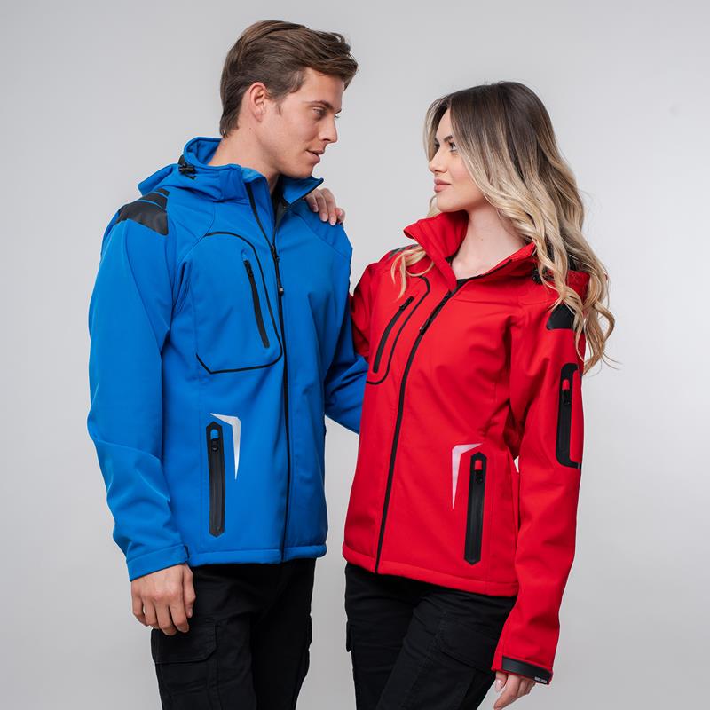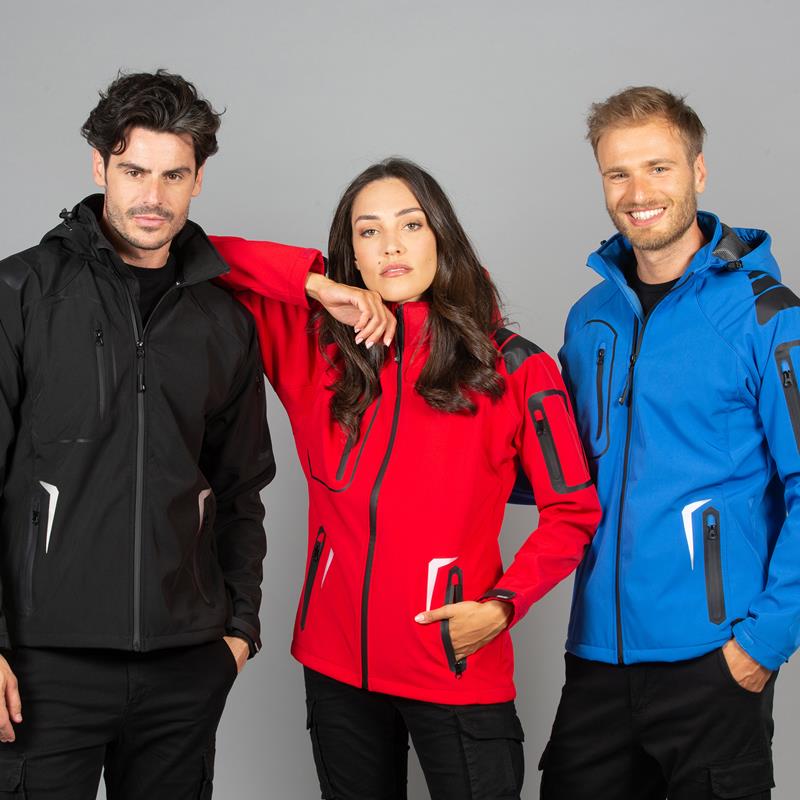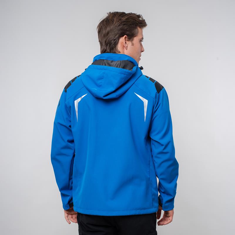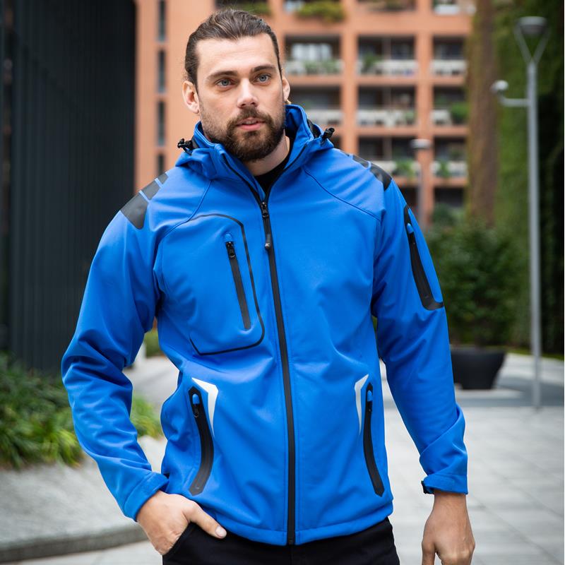 Opis Softshell jacket 3 layers, waterproof and breathable - 97% polyester - 3% elastan - Waterproof 6000 mm/H2O - Breathability 4000 g/M2/24h - Thermic lining inside the front part - Reflective printing on front and back side - Raglan sleeves - Detachable padded-hood with drawstring - Laser cutting zip - One chest pocket with zip - Two pockets with zip - Inner wallet pocket - Elastic cuffs with velcro closing - Drawstring at the bottom