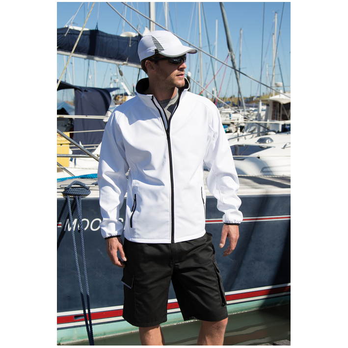 telesu prilegajoči se kroj, stoječ ovratnik, sprednja zadrga po celotni dolžini, s ščitnikom za brado, sprednji žepi z zadrgo, brez elastana, posebna struktura preje brez elastana za dobro natisljivost materiala in njegovo elastičnost, nevtralna etiketa z oznako velikosti, okrasni šivi, obroba na zaključkih rokavov je elastična, jakna je vodoodporna in ne prepušča vetra