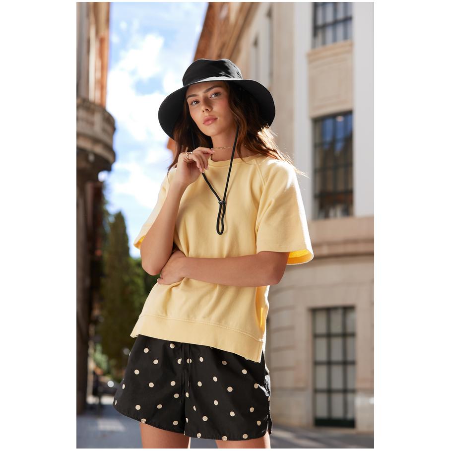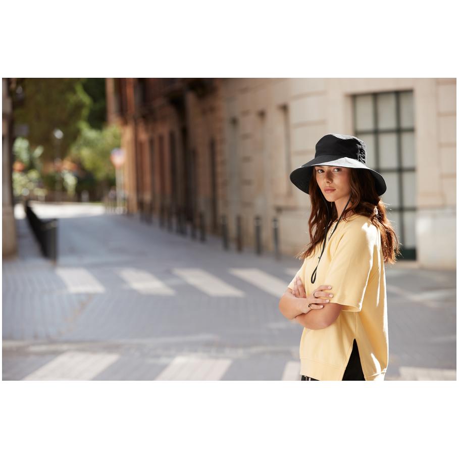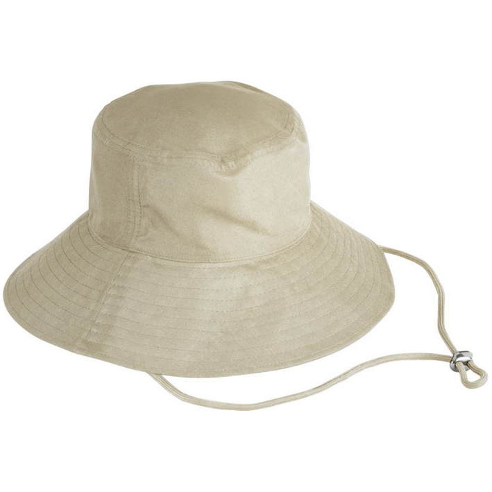 Wide, slanted brim, water repellent material, adjustable chin strap, UV protection 50+, TearAway label, sponge clean only