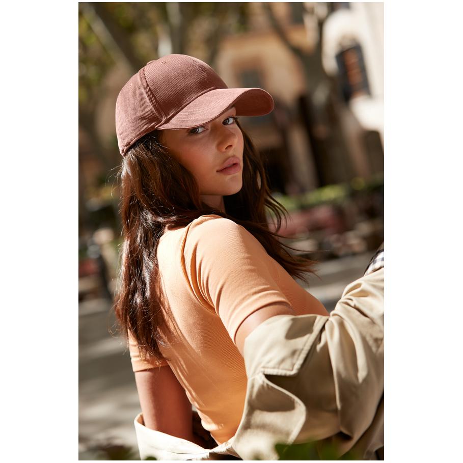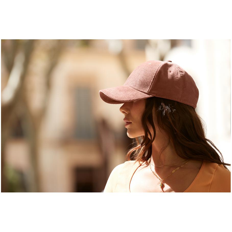 Curved visor, cotton sweatband, reinforced front panels, medium cap profile, stitched eyelets, fabric fastener with metal buckle, TearAway label, sponge clean only