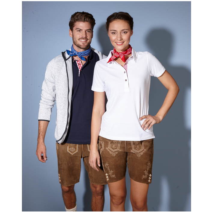 klasična polo majica, tradicionalen izgled, vstavki karirastega vzorca na stoječem delu ovratnika, na podrobku letvice za zapenjanje in na stranskih razporkih, trije gumbi v imitaciji roževine, ovratnik na gumbe, polmesečni hrbtni opleček enake barve kot majica