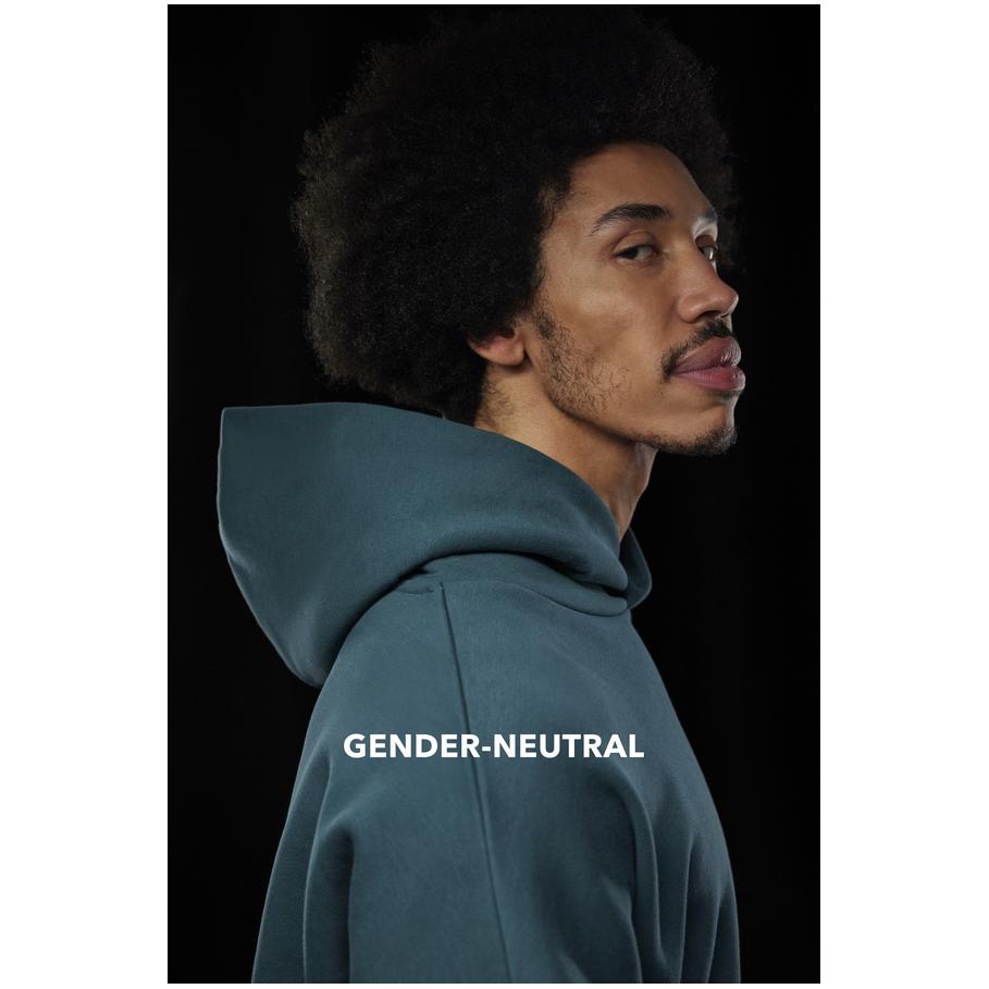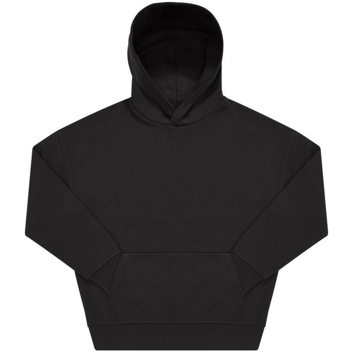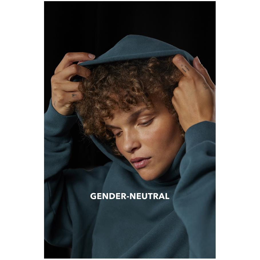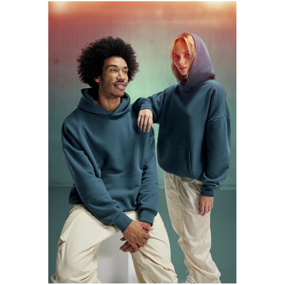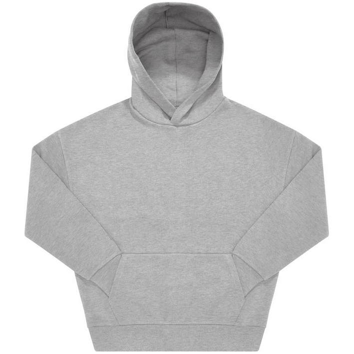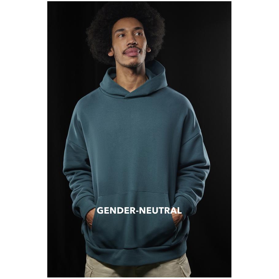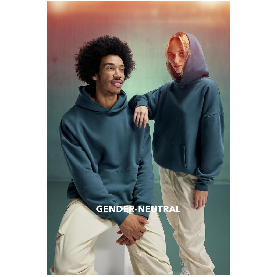 Opis Oversize fit, hood without cord with cross collar, darts and lining made from the same fabric, ribbed cuffs on sleeves and hem, kangaroo pocket, offset seams on the shoulder, LSF (low shrinkage fleece) for less shrinkage, PST-yarn technology, surface made of 100% cotton, brushed inside, neutral size label, 30° washable, not suitable for tumble drying