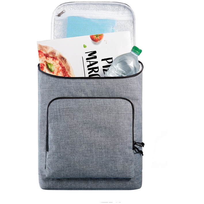Opis hladilni nahrbtnik, Pokrov prevleke z obodno dvosmerno zadrgo na treh straneh, ročaj, nastavljive in oblazinjene naramnice, popolnoma izoliran glavni predal, oblazinjeno hrbtišče, mrežast predal na zadrgo za hladilne elemente, velik sprednji žep z dvosmerno zadrgo, velikost: 30x42x15 cm