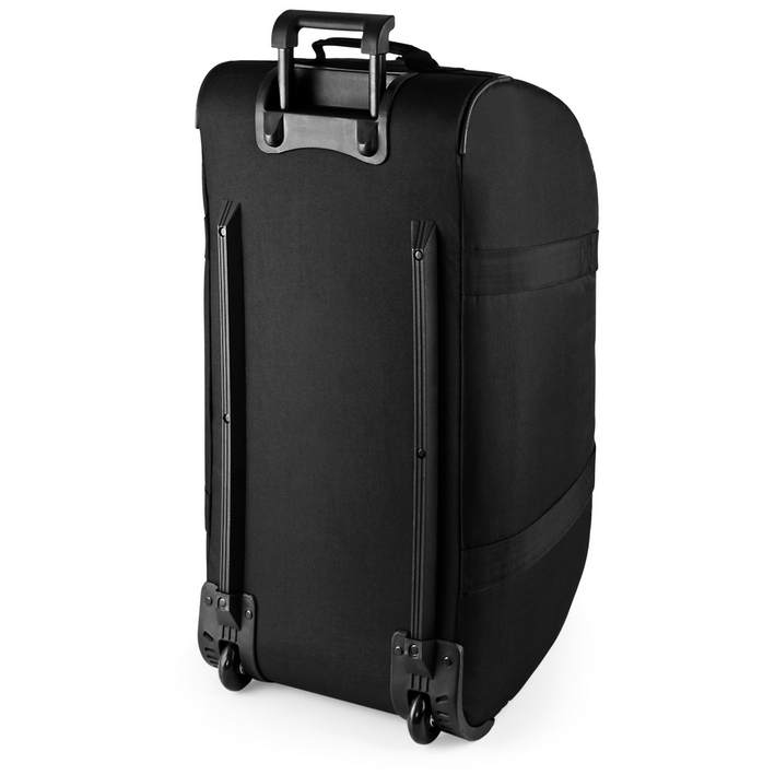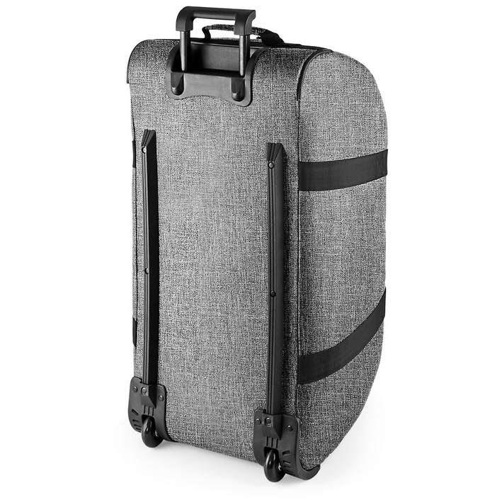 Opis Trpežna kolesca, zložljiv pločevinast ročaj za vleko, žep z zadrgo na strani, zaklepanje glavne zadrge, snemljiva nastavljiva naramnica, oblazinjen ročaj, velikost: 75x38x35cm, prostornina: 105l
