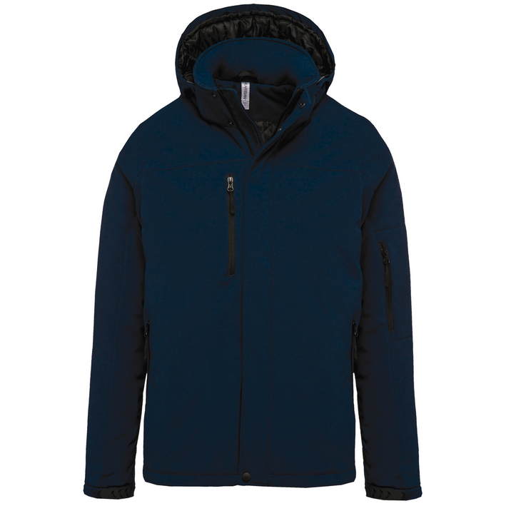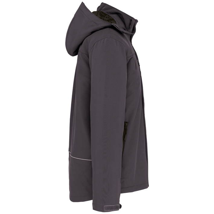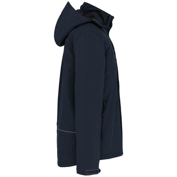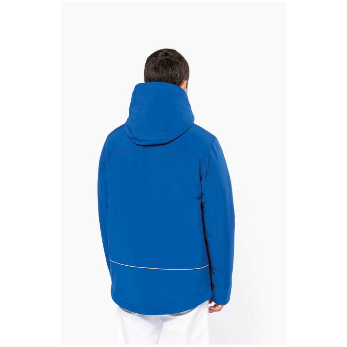 3-layer fabric, waterproof (8,000mm water column), breathable (3,000g/m² in 24h), detachable hood with drawstring, adjustable cuffs with velcro fastener, 2 inside pockets with button, sleeve pocket with zip, 2 side pockets and 1 breast pocket with zip, quilted lining with fleece, decoration access on the back and left chest