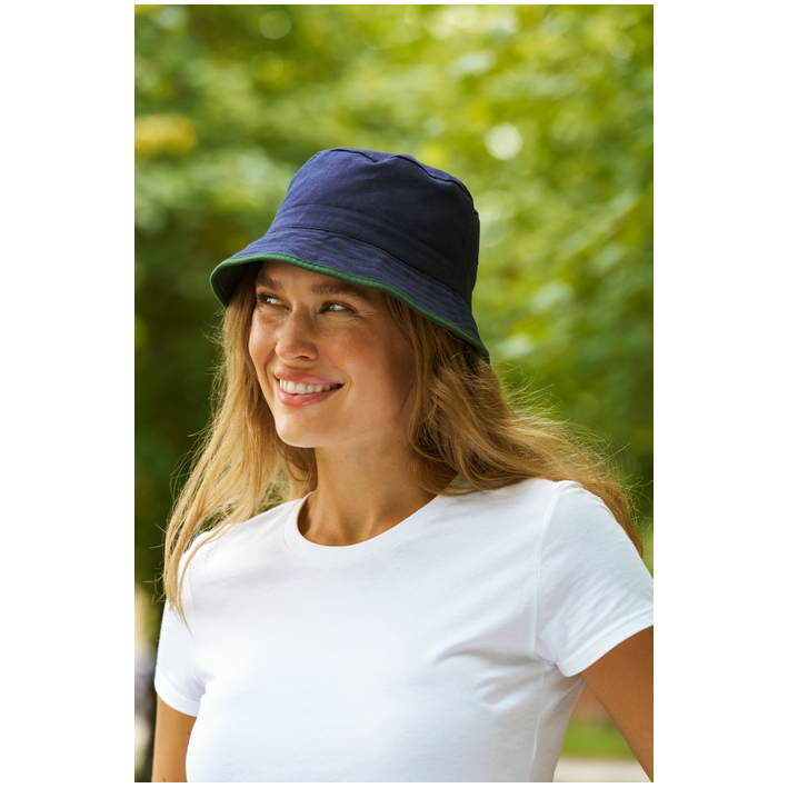 Opis Slanted brim with decorative stitching, inside and finish in contrasting color, portable on both sides, 60° washable, 40° wash recommended, suitable for tumble drying at low temperature