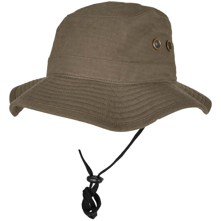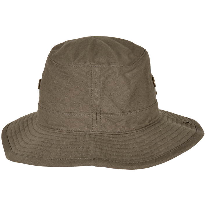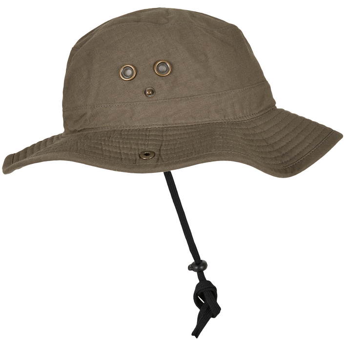 Opis Wide, flat brim, side press studs for fastening to the brim, 8 decorative stitching on the brim, hatband with stopper, 4 laterally arranged metal eyelets, do not wash, do not iron, not suitable for tumble drying, do not dry clean
